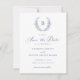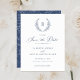 Elegant Laurel Wreath Monogram Crest Wedding Enregistrer la Carte Date. Mariage traditionnel Enregistrer la date Invitation. Cimetière de monogramme de couronne bleu marine Enregistrer la carte de date