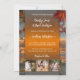 Faire-part de mariage unique avec 4 de vos photos préférées encadrées par un design industriel d'automne rustique avec des feuilles colorés.