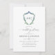 Faire carte de invitation de mariage avec monogramme de la crête feuillue avec une typographie calligraphiée élégante personnalisable avec les initiales du couple.