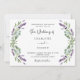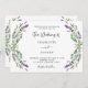 Un arrière - plan blanc décoré de fleurs de lavande et de verdure d'eucalyptus. Personnalisez et vos noms et détails. Retour : ajoutez l'URL de votre site Web mariage au code QR pour plus de détails et/ou RSVP.