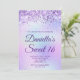 Créez votre propre invitation à célébrer le 16e anniversaire pour votre fille. Les graphiques de parties scintillant de lavande brillante de décoration forment une bordure supérieure. L'art numérique arrière - plan présente une feuille de style arc-en-ciel irisée et légère. Customisez l'invitation couleur de texte royal violet ou styles de police. Le texte "Sweet 16" est également personnalisable. Les scintillants de luxe, la parties scintillant et la feuille seront créés avec des éléments artistiques qui s'impriment comme une photo.