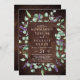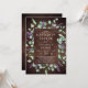 Ce faire-part de mariage à charpente fleurie en lavande rustique est parfait pour une mariage extérieure simple et élégante. Le design floral présente des feuilles d'eucalyptus aquarelle et de la verdure avec des sprigs de fleurs sauvages violets sur l'arrière - plan en faux bois.