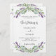 Un arrière - plan blanc décoré de fleurs de lavande et de verdure d'eucalyptus. Personnalisez et vos noms et détails. Retour : Personnalisez et ajoutez votre photo dans le cadre de l'arc.