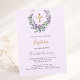 Arrière - plan violent. Une couronne fleurie faite de fleurs de lavande, une verdure d'eucalyptus aquarellée et une croix dorée. Personnalisez et ajoutez un nom et des détails.