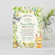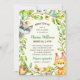 Une charmante invitation au baby shower sur le thème des bois. Ce invitation de baby shower sans distinction de sexe présente d'adorables animaux de forêt illustrés à la main, dont un petit renard sucré, un raton laveur, deux oiseaux chantant et même un mignon petit hérisson. Une couronne de feuillage luxuriant encadre les détails du baby shower. Personnalisez facilement vos informations sur la douche.