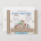 Baby shower invitation pour bébé garçon en bleu avec l'Arche de Noé avec tous les animaux, nuages et arcs-en-ciel dans le "Baby shower" arrière - plan en bleu sur le dessus et bordé de rayures brunes et personnalisable pour le faire pour votre propre invitation à la fête.