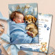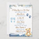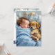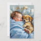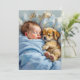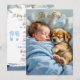 Une jolie invitation baby shower pour le baby shower d'un garçon. Un bébé jeune et doux qui fait la sieste avec son petit chiot. Les couleurs sont bleu et marron pour cette invitation.