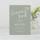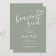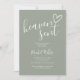Une invitation tout-en-un minimaliste moderne avec un coeur à main mignon, code QR du registre, et des détails de l'événement ensemble avec typographie stylisée sur un arrière - plan vert sage. Conçu par Thisisnotme©