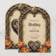 Le coeur des dieux anciens : Un cadre celtique magique. Un cadre orné d'inspiration celtique avec des motifs de noeud complexes dans les tons or et marron. Un ornement en forme de pique avec un noeud est situé en haut, et un noeud en forme de coeur est situé en bas, flanqué de fleurs orange et rouge éclatantes. Le design allie tradition, force et vitalité.