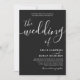Une invitation de mariage noire sophistiquée avec une typographie élégante sur un fond sombre dramatique. Le design minimaliste met en valeur les noms des mariés avec une calligraphie gracieuse, créant une esthétique intemporelle et romantique parfaite pour les mariages modernes, formels ou en soirée.