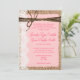 Invitations de mariage roses et Brown.Ce faire-part de mariage rustique est parfait pour tous les mariages occidentaux du pays. Il présente un arrière - plan rustique imprimé en burlap des deux côtés de l'invitation. Le lettrage de l'invitation est imprimé sur un rectangle rose en lambeaux avec une dentelle imprimée sur le côté. Le dessus est orné d'un imprimé à ficelle. Le burlap, la dentelle et la ficelle ne sont que des dessins imprimés. Il ne s'agit pas d'un tissu de burlap réel ou d'une dentelle ou ficelle réelle.