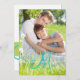Employez ces invitations modernes vert clair, blanches et turquoises simples, pourtant sophistiquées de mariage de photo avec votre l'initiale de monogramme et noms de jeunes mariés en texte turquoise et vert d'inviter vos invités à votre mariage. La combinaison de couleurs est parfaite pour un mariage de ressort et un mariage d'été. Une belle, moderne conception avec votre photo de fiançailles. © d'ELKE CLARKE pour la galerie de monogramme. Montré sur le livre blanc de base.