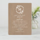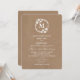 Un faire-part de mariage de monogramme comportant une illustration d'une guirlande florale blanche en haut. Personnalisez avec votre initiale à l'intérieur de cercle. Personnalisez le texte avec des détails de votre occasion. Les mots sont des jeunes mariés ainsi que leurs familles. L'arrière - plan est papier brun inspiré.