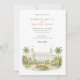 Invitation vos invités à une occasion vraiment mémorable avec cet exquis faire-part de mariage d'aquarelle, présentant l'emblématique Breakers Hotel à Palm Beach, Floride. L'oeuvre d'art illustre magnifiquement la grandeur de la station de luxe historique, blanche et crème, avec ses tours jumelles signées fièrement arborant des drapeaux américains. Décorée dans un style d'aquarelle doux et élégant, la scène est encadrée par un paysage tropical luxuriant composé de grands palmiers verts gracieux. Au premier plan, un lit de fleurs circulaires et éclatant présente de belles fleurs aux tons rouges et roses doux, peut-être des plantes roses ou classiques, complétées par un feuillage vert riche et des pelouses méticuleusement manucurées. Cette invitation exsude le raffinement et est parfait pour un mariage de luxe de destination ou une fête de Floride classique. L'avant présente élégamment les détails de votre mariage, tandis que l'arrière offre les "Détails du Finer" pour plus d'informations. La palette de couleurs comprend des blancs immaculés, des crèmes chaudes, des verdure verdoyante des palmiers et des pelouses, des rouges et des roses vifs des fleurs, et des tons de sable subtils des allées.