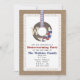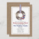 Une invitation à la fête de réchauffement avec une illustration d'une couronne monogrammée avec un schéma de couleur rouge blanc et bleu. La couronne présente des rosettes et est suspendue au ruban du chevron. Arrière - plan inspiré par burlap. Personnalisez la couronne avec la lettre de votre initiale. Personnalisez le texte avec les détails de votre occasion.