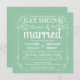 Mangez, buvez, et soyez marié -- Invitations rustiques élégantes de mariage campagnard de style -- Les rouleaux tourbillonnants et bouclés et la typographie vintage de vieux-mode dans le lettrage blanc d'éblouissement sur le julep en bon état de melon en pastel verdissent l'arrière - plan. Ajoutez les noms de jeunes mariés et information de épouser dans ce modèle facile à utiliser. La fantaisie, l'amusement et la calligraphie manuscrite lunatique et rétro de style de craie peuvent être modifiés pour votre thème formel ou semi-formel de mariage. Le style moderne décontracté mais chic est parfait pour des mariages contemporains à la mode avec un contact de charme sophistiqué romantique pour les couples traditionnels. Perfectionnez pour le ressort, l'été ou les mariages de automne. Veuillez nous contacter pour l'aide avec la personnalisation si vous avez besoin de la pièce supplémentaire pour vos détails de mariage. NOTE : Montré sur les cartes standard d'invitation de la taille A7. D'autres tailles et styles disponibles, avec les timbres-poste assortis, la papeterie nuptiale coordonnée, épousant des faveurs d'accessoires de paquet et de douche.
