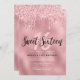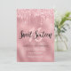 Ce design d'invitation moderne présente une parties scintillant de texture métallique à goutte d'or rose faux rose et une police de calligraphie élégante.