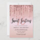 Ce design d'invitation moderne présente une texture métallique de parties scintillant à goutte d'or faux rose et cuivre rose et une police de calligraphie élégante.