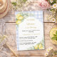 Celebrate your upcoming bundle of joy with this elegant lemon-themed baby shower invitation. Featuring a soft dusty blue and white gingham background, delicate watercolor lemons, fresh greenery and a blue bow, this design creates a warm and inviting atmosphere perfect for a summer or citrus-inspired baby shower.