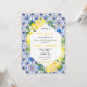 This fun and whimsical baby shower invitation features watercolor citrus lemons and foliage on a Mediterranean tile background. The text combines handwritten script and serif fonts for a stylish and modern look. This is perfect for a summer rustic baby shower.
