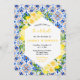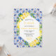 This fun and whimsical birthday party invitation features watercolor citrus lemons and foliage on a Mediterranean tile background. The text combines handwritten script and serif fonts for a stylish and modern look. This is perfect for a summer rustic birthday party.