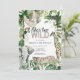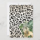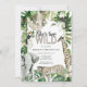 L’invitation pour un safari Wild 2e anniversaire de la jeune femme est composée d’une jungle tropicale avec des paresseux, des singes, des girafes, des éléphants, des toucans et des léopards. Le dos de l'invitation présente un arrière - plan empreinte de léopard avec des plantes tropicaux et le lion.