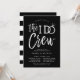 Une réunion est prévue pour l'équipe Ido. Faites savoir directement à tous les membres de votre mariage que leurs services sont nécessaires pour un dîner de répétition avec ces cartes d'invitation ludiques et formelles. Le design comporte les mots "I do team" dans un style de script élégant et moderne. Le mot 'do' comporte une bague en diamant brillante à la place de la lettre 'O' pour signifier le mariage de la mariée et du marié. A l'envers, des rayures noires et blanches chic. Ce design est entouré de spots pour vos informations uniques et les détails du texte.