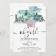 Girls Adventure Begins Wilderness Baby shower Invitation Cette aventure commence baby shower invitation présente une atmosphère de couleur de l'eau paysage sauvage avec pins et montagnes et une camionnette rose. Idéal pour le baby shower à thème sauvage ou aventure d'une fille.