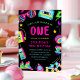 Cette invitation d'anniversaire amusante et colorée présente des modèles rétro des années 80 (lunettes de soleil, cassette, téléphone, roller skates, et plus encore)! Les couleurs du néon (rose magenta, jaune, vert citron, aqua et violet) font vraiment de cette invitation la pop ! Parfait pour lancer une fête de premier anniversaire sur le thème des années 80 pour votre petite fille ! Le dos contient un motif de cordon de téléphone enroulé en rose magenta. La couleur arrière - plan et la plupart des couleurs de texte peuvent être customisées, si désiré.