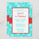 Une jolie invitation au flocon de neige pour une fête d'anniversaire d'un enfant ou d'une fille d'un an sur le thème des ONEderland en hiver. Montré en bleu turquoise, rouge et blanc. Personnalisez facilement votre fête !