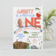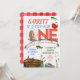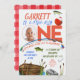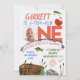 Boys Reel In Fun Ofish One 1st Birthday Invitation garçons mignons pêche à thème invitation d'anniversaire avec un grand mot rouge, canne de pêche, poisson, leurres de bateau et plus. Votre photo de petit garçon apparaît dans le cadre rond qui remplace le o en un.