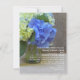 faire-part de mariage avec une photo d'un pot de mason d'hydrangées bleues. Jar est assis sur une surface de robinet. Arrière - plan, c'est du bois d'écorce.