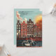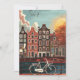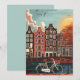 Illustration d'Amsterdam, la capitale de la Pays-Bas, on y trouve de charmantes maisons colorées le long d'un canal, une bicyclette blanche au premier plan, et des arbres d'automne sous un ciel bleu avec des oiseaux volant.