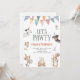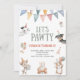 This birthday party invitation features "let's pawty" and lots of dogs to invite friends and family to a birthday party for your dog-loving little one.