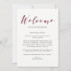 Cette lettre de bienvenue de mariage élégante, à insérer dans vos sacs de bienvenue pour invités de mariage, présente une calligraphie couleur marsala / burgundy ainsi que du texte noir moderne sur un fond blanc propre.