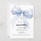 A white background, decorated with a light blue large bow and a golden cross. Personalize and add a name and details details.
