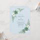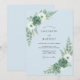 This design features a serene palette of light blue and sage green. Delicate white anemones and lush succulents are nestled among forest ferns and silver dollar eucalyptus. Earthy golden sprigs add a touch of warmth to the cool botanical arrangement. The nature-inspired aesthetic creates a romantic atmosphere for a winter or spring event.