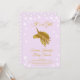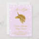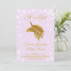 Cette jolie invitation en baby shower lilas décorée d'une licorne d'or illustrée, C'est une fille écrite en couleur or et des flocons de neige, ce qui en fait parfait pour une douche d'hiver magique.