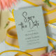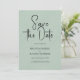 Whimsical minimaliste moderne, personnalisable typographie de script noir, élégante invitation à sauvegarder la date. L'arrière - plan de texture de lin imprimé vert pâle ajoute une touche d'élégance classique et organique. D'autres couleurs sont disponibles.