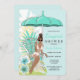 L'invitation à la douche de lingerie de mariage présente des fleurs tropicales bleues et sarcelles de l'œuf de merle, un parapluie et la future mariée afro-américaine. Disponible avec des cheveux blonds, bruns et roux et une peau claire et foncée.