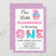 Petite petite cupcake violet parties scintillant de premier anniversaire avec des lettres de beignes et de bonbons. Ajoutez facilement votre nom complet, ainsi que la date, l'heure et l'adresse de la fête d'anniversaire. Parfait pour une douce petite princesse qui en tourne un !