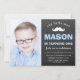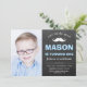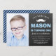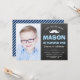 Éblouissez vos invités avec cette invitation moderne de 1er anniversaire avec une mignonne moustache avec typographie moderne contre un arrière - plan de tableau noir. Ajoutez simplement les détails de votre événement sur ce modèle facile à utiliser et ornez cette carte avec la photo préférée de votre enfant pour en faire une invitation unique. Retournez la carte pour révéler un motif à rayures bleues et blanches au dos de la carte.