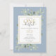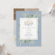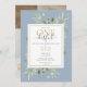 Petite M. ONEderful photo invitation de premier anniversaire avec élégante verdure sur un arrière - plan bleu, typographie élégante, et une photo spéciale du garçon d'anniversaire au verso. Conçu par Thisisnotme©