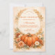 A warm and cozy fall baby shower design featuring a hand-painted watercolor pumpkin surrounded by soft peach florals, golden leaves, and delicate autumn accents. The earthy orange palette and elegant arch layout create a refined harvest aesthetic that feels timeless and inviting. Perfect for an autumn celebration, a neutral fall theme, or a charming “Little Pumpkin” baby shower with rustic floral details.