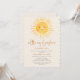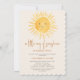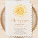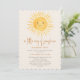 Prévoyez-vous un baby shower sur le thème du soleil ? Cette invitation de baby shower de soleil boho comprend le texte "Un petit rayon de soleil est presque ici! avec une jolie aquarelle souriante soleil jaune sur un arrière - plan doux et crème à la pointe Saint-Jacques. Parfait pour un baby shower sans distinction de genre. Facile à personnaliser. Aquarelle originale © Michele Davies.