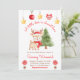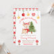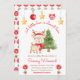 This cute and festive watercolor baby shower invitation features an adorable reindeer in a red scarf with hanging ornaments and lollipops. This is perfect for a Christmas themed baby shower.