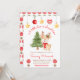 This cute and festive watercolor baby shower invitation features an adorable reindeer in a red scarf with hanging ornaments and lollipops. This is perfect for a Christmas themed baby shower.