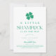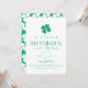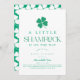 This chic and modern "a little shamrock is on the way" baby shower invitation features a shamrock with sophisticated typography. The reverse side features a green/light teal background with a green shamrock pattern. Perfect for St. Patrick's Day baby shower! Personalize it for your needs. You can find matching products at my store.