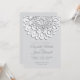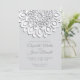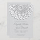 Invitations de mariage modernes et élégantes avec un mandala coupé en papier blanc sur le noir avec du texte gris.