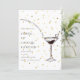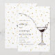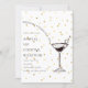 Carton d'invitation élégant et original pour une soirée à thème cocktail. Le design présente une illustration chic d'un verre à martini avec des accents de paillettes dorées scintillantes sur un fond blanc propre, parfait pour les événements et les célébrations haut de gamme.